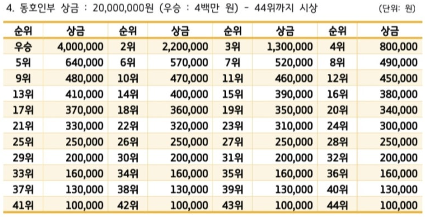 동호인부의 상금은 1위부터 44위까지 시상금이제공 됩니다. 더욱 정확한 상금은 아래에서 확인해 보시기 바랍니다