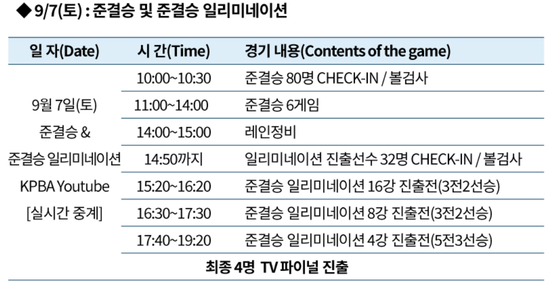 본선에서 총 80명이 준결승에 진출하여 9월 7일(토요일)에 준결승 및 준결승 일리미네이션 경기를 진행합니다.